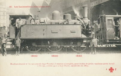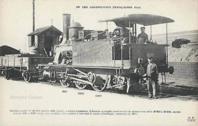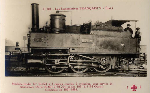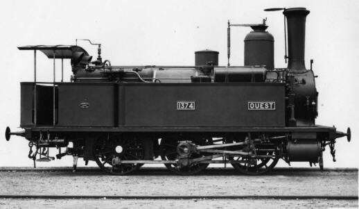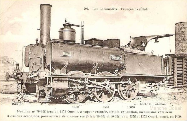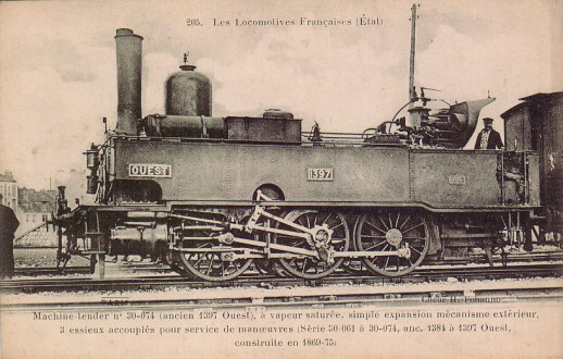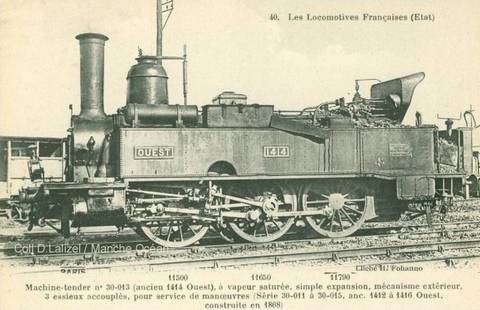 1873: locomotives 1412 à 1416Ces machines proviennent de l'ancienne compagnie d'Alençon - Condé. Machines à roues de 1,40 m, elles seront immatriculées 30-011 à 015 en 1909.
