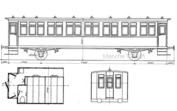 L'État va s'inspirer du matériel "Polonceau" du PO et construire de longues voitures à deux essieux. Elles comportent des plateformes fermées et un couloir latéral qui permet la circulation d'un coté à l'autre de la voiture. Un compartiment toilette est disponible à une extremité de la voiture. Ces voitures ne comportent pas de tirant sous le chassis, la tole du bandeau inférieur rivetée au chassis rigidifie la voiture selon les dispositions employées au PO, d'où l'appelation de voiture "semi métallique".