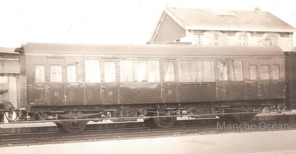Voitures à couloir partiel en gare de Lison vers 1900, avec une voiture de 2eme coté compartiment portes ouvertes, puis une voiture de 2eme coté couloir.