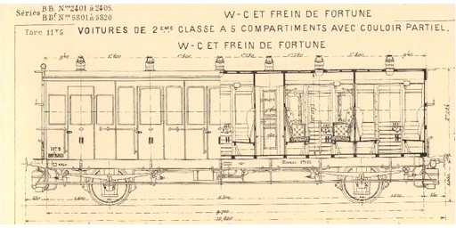 La particularite de ce matériel mixte réside dans la présence d'une toilette par classe, chaque toilette étant placée d'un coté au centre de la voiture. Un couloir dessert les 3 compartiments de première classe, un autre dessert les 3 compartiments de seconde de l'autre coté du véhicule, aussi les baies des faces comportent un panachage de grande baies coté couloir et de petites baies de custode cotés compartiments. Ici, le petit lanterneau au centre de la toiture abrite la réserce d'eau des toilettes.
