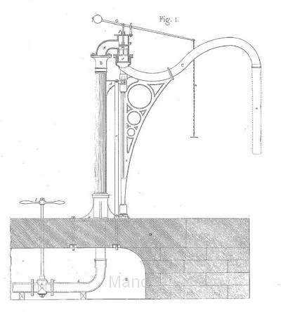 Ces grues à eau sont constituées d'une colonne en fonte coiffé d'un réverbère à gaz. La colonne est creuse et comporte une conduite interieure qui débouche au sommet de la colonne en fonte. Un tuyau de gaz court le long de cette conduite pour alimenter le réverbère. L'alimentation de la machine s'effectue par un tuyau souple à l'aide d'un volant ouvrant une vanne située en sous sol.