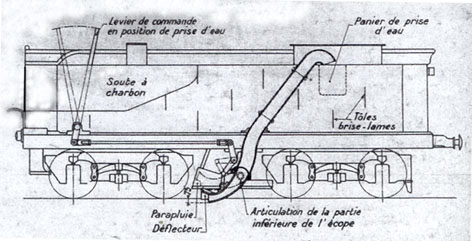 Sur une voie, en palier, un bac rempli d'eau de 15 cm de haut et environ 400 mètres de long est placé entre les rails. Quand la locomotive ou plus exactement le tender arrive sur cette rigole un bec ou écope est abaissé. Grâce à la vitesse, entre 40 et 80 km/h, l'eau remonte dans le tender. Oui, comme le feront beaucoup plus tard les canadairs !
