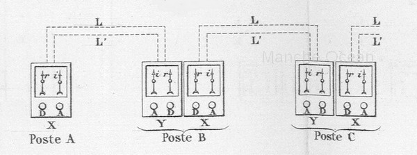 L'agent du poste B sait que la voie est occupée. Lorsque le train arrive au poste B, l'agent de ce poste ferme son signal et appuie sur le bouton "Arrivée" du poste B, ce qui transmet l'information au poste A et ramène l'aiguille I du poste A en position verticale de voie libre. Il informe aussi le poste C du départ du train, et ainsi de suite.